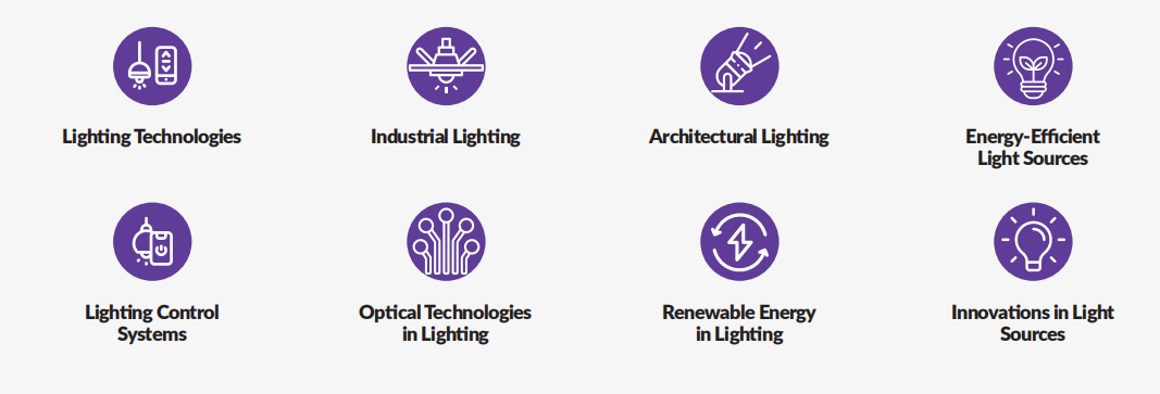 照明类: 装饰照明、电光源、LED照明系统、节日照明、技术照明、电气工程及技术、楼宇自动化、相关服务,包括:灯饰设计软件、照明建筑行业研究、专业出版物等