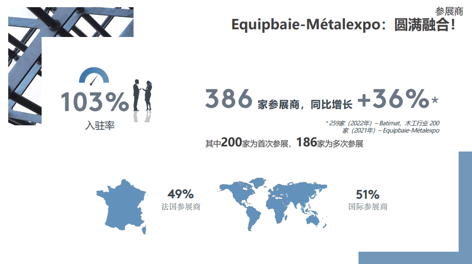 巴黎国际建材、暖通、卫浴展包括BATIMAT(巴黎建筑及建材展)、INTERCLIMA(暖通制冷展)和IDÉOBAIN(卫浴展)。展会将业界决策者、建筑行业专家和项目经理聚集在一起,购买新产品、寻找灵感,通过寻求行业创新和重要成果来丰富产品线开展业务,并通过培训课程展示分享经验。这里是为每一项技术发展和行业监管寻找解决方案的地方。展出的设备、技术、工具和解决方案力求卓越:低碳、节俭、舒适、循环和重复使用、数字化解决方案等。