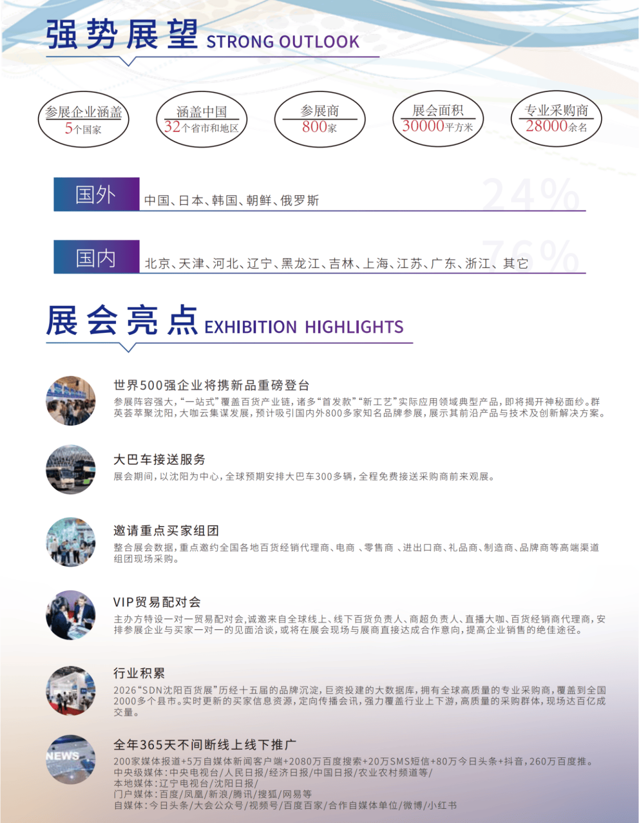 “2026 SDN 沈阳百货展” 旨在搭建集展示、交流、合作于一体的综合性平台,助力行业发展与市场繁荣。一方面为企业提供集中展示新品的机会,帮助企业更快地进入目标市场;另一方面推动产业链上下游合作,参展商可与零售商、批发商及电商平台建立直接联系,形成更为紧密的合作关系。