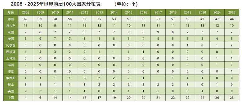 2025 年 9 月 11 日,国际展览业协会(UFI)在全球会展创新发展大会上正式发布《2025 世界商展 100 大排行榜》。这一具有 17 年历史的权威榜单,在经历疫情停摆后强势回归,以最新数据揭示全球会展业复苏态势与格局重构 —— 中国会展业以 28 席历史性突破稳居第二,与德国(44 席)共同占据全球 72% 的头部商展资源,标志着亚洲力量正式跻身全球会展核心圈层。