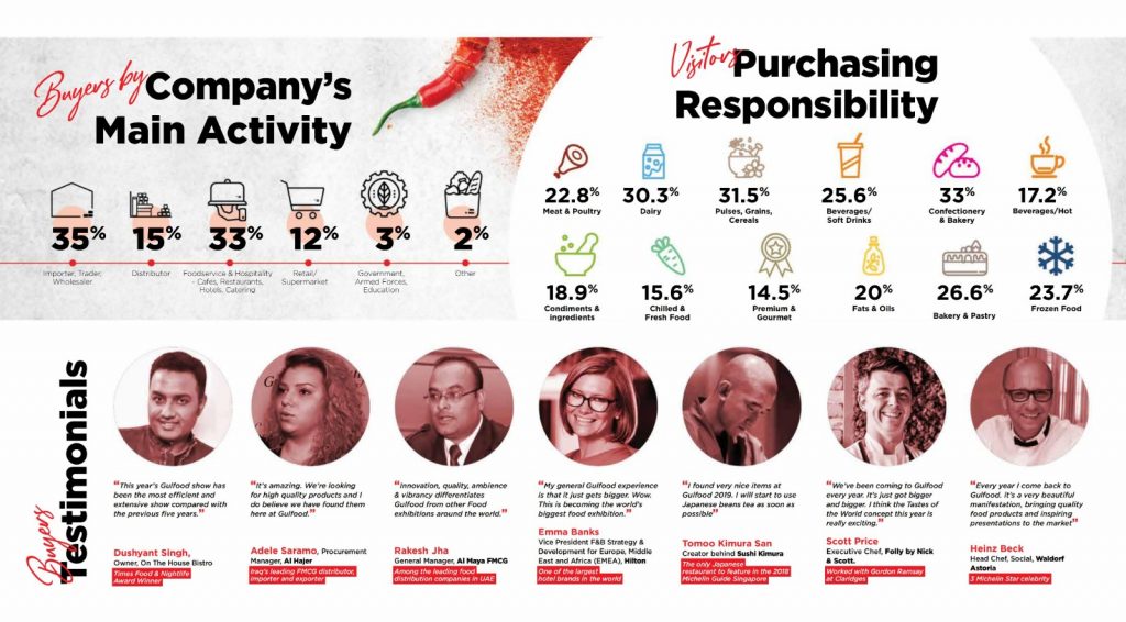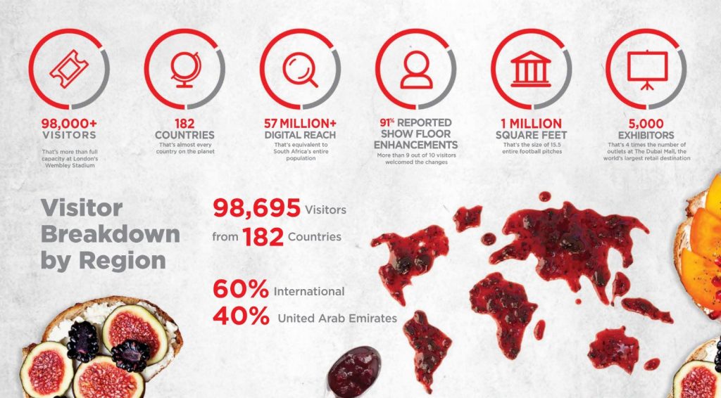 上届海湾食品展是中东区域年度最受关注行业盛事和贸易平台。数字为证:展会共设有81个国家馆,由政府部门,各个行业内的出口协会以及其他合作单位承办,吸引了来自110个国家的4200名展商,来自世界152个国家的77609名业内买家,比2012年增长13%,展会面积共计113388平米,比往届增长24%。没有其他一家同行业展会能与之在规模上相媲美,给参展者提供如此巨大的销售机会, 让您的参展产品在中东地区最大的食品饮料进口市场得到最高的”曝光率”.
