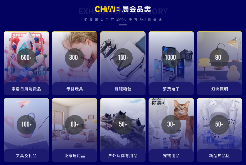 深圳出海网全球跨境电商展(CHWE) 集聚全国制造业产业带: 12大品类及特色产业品类, 10大特色产业馆、3000+I厂品牌展商,覆盖跨境全品类,为跨境卖家提供跨境选品大舞台。