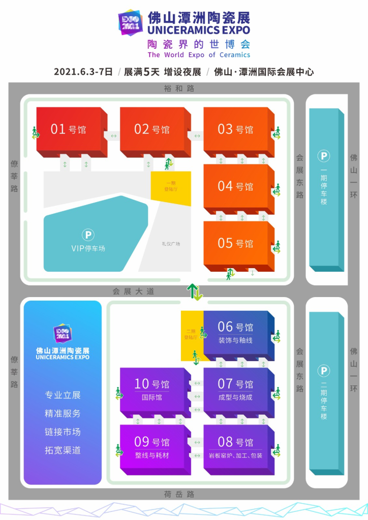 1-5号馆:瓷砖、岩板、进口砖、地铺石、木纹砖、马赛克、软瓷、新型陶瓷材料等