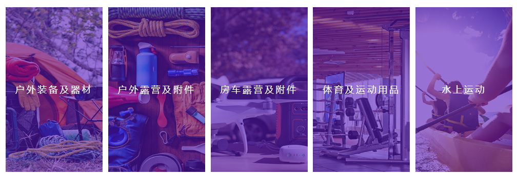户外露营及附件类展区:长途旅游、户外房车、太阳能背包、登山包、急救包、指南针/定位系统、炊具/燃料、急救用品、应急灯、登山鞋,徒步鞋,高山靴,攀岩鞋,沙滩鞋/凉鞋、户外休闲鞋、户外手电筒、护具、户外水壶、头盔、防潮垫、地席水壶、水具炉具、烧烤炉、通讯/导航、户外刀具、户外表、射击、望远镜、登山杖、手杖毛巾、户外移动电源等