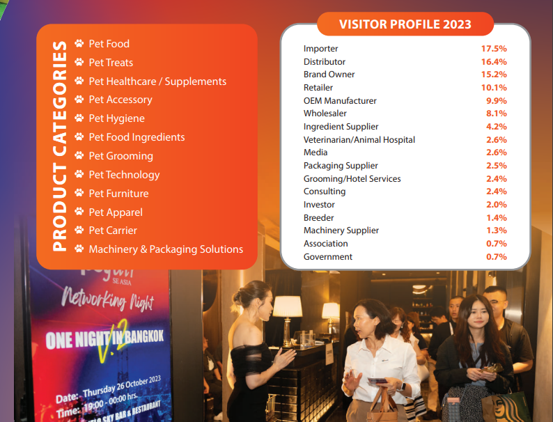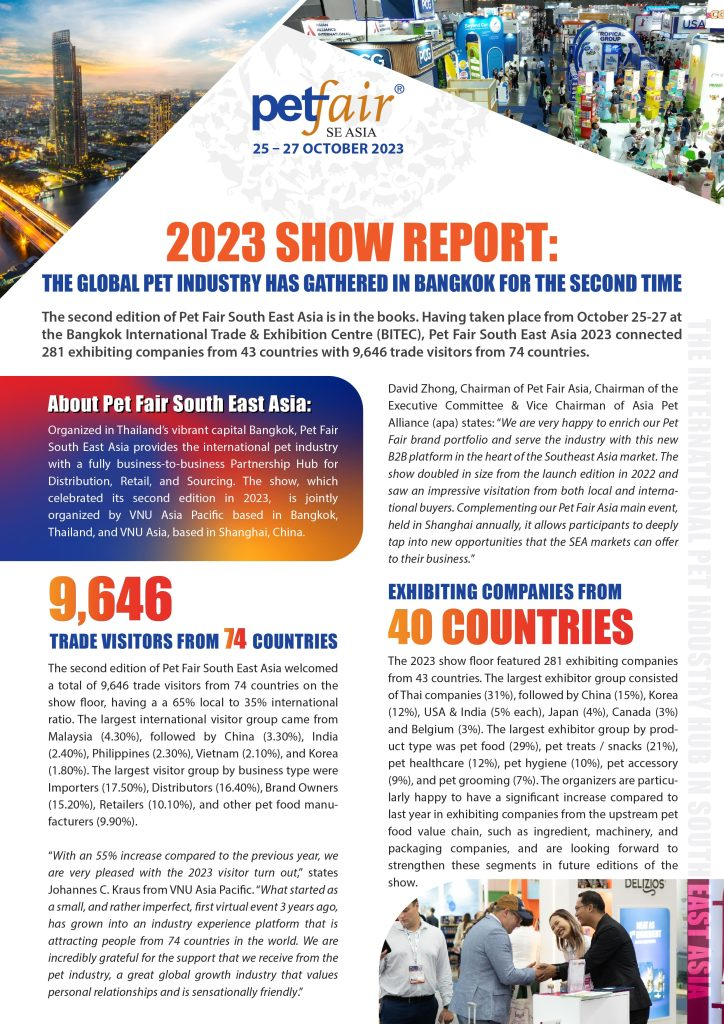 全球宠物行业 2024年重返曼谷。东南亚宠物展在泰国充满活力的首都举办,为国际宠物行业提供了一个完全的企业对企业的分销、零售和采购合作中心。该展览将于2023年举办第二届,由位于泰国曼谷的VNU亚太公司和位于中国上海的VNU亚洲公司联合举办。 在2023年的第二届展会上,东南亚宠物展共迎来了来自74个国家的9646名贸易参观者,展出了来自43个国家的281家参展公司,证明其行业影响力远远超出了东盟地区。
