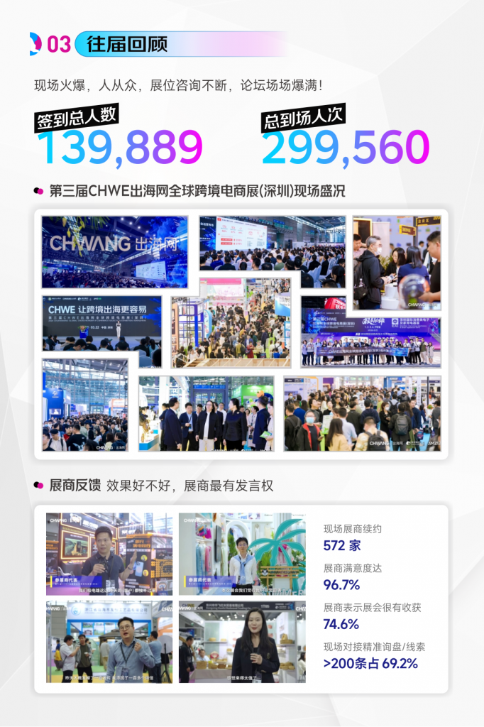 2025年第四届深圳全球跨境电商展(CHWE)将于2025年3月20日至22日在深圳福田会展中心再续展会盛况,该展是国内跨境电商领域的一场重要展会,汇聚了来自全球的医疗、美容、口腔、保健、家居、婴童、酒店、礼品、电子、游戏、网络、通信、纺织、服装、皮革、箱包等多个行业的展商,共同展示最新的产品和技术。2025年展位预定火爆,展览规模再次升级,将达到100000平方米,预计将吸引超过3800家展商参展。
