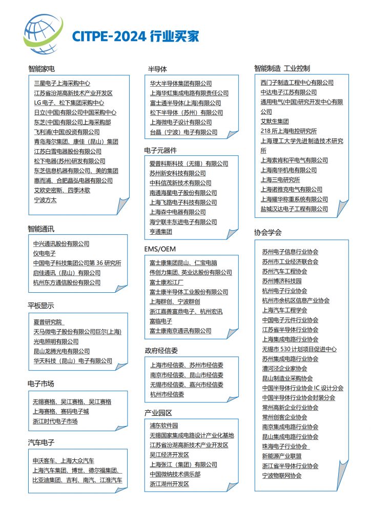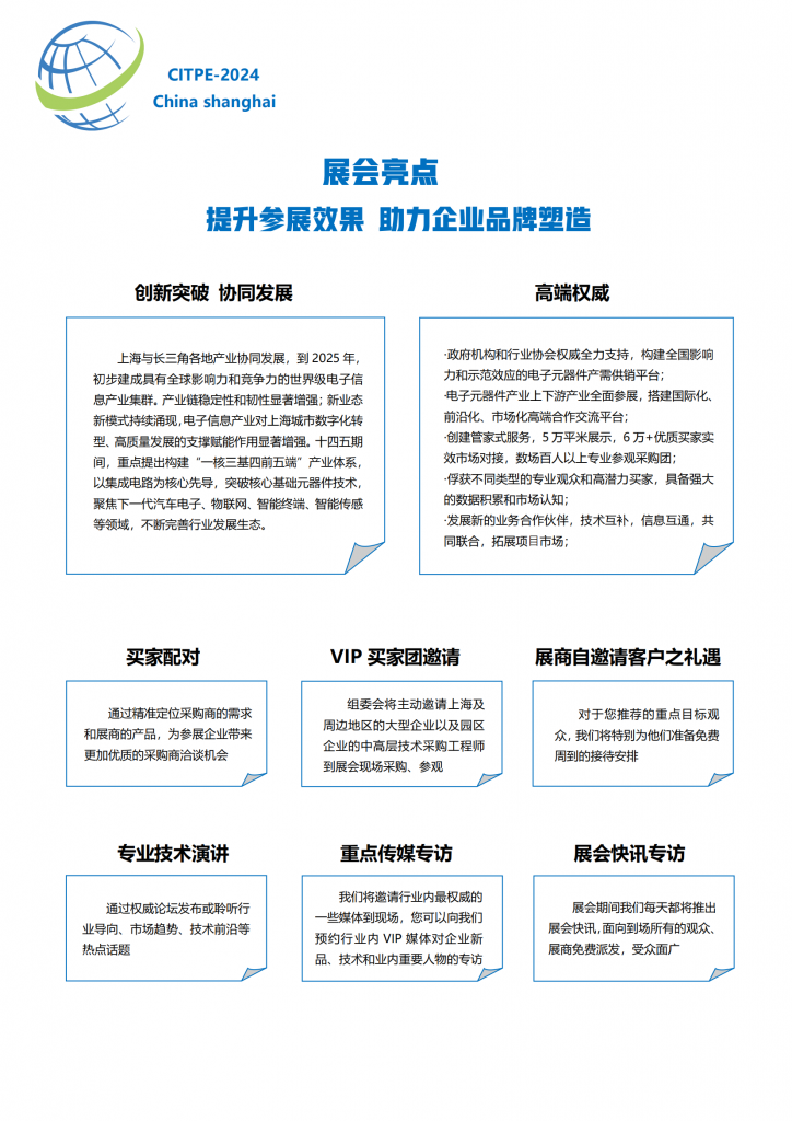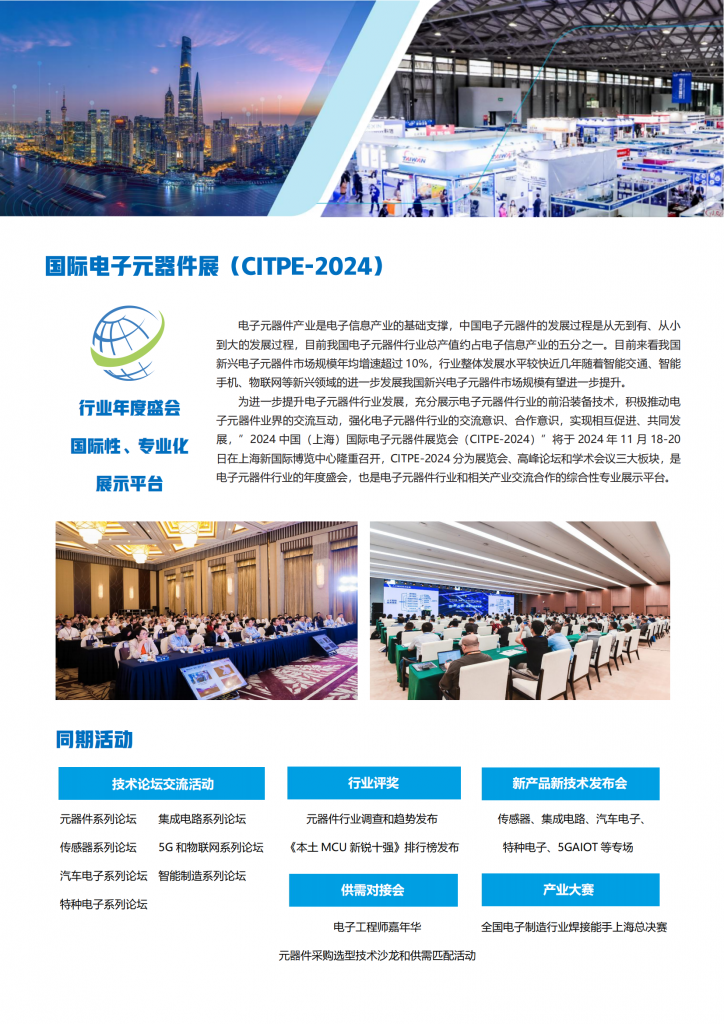 为进一步提升电子元器件行业发展,充分展示电子元器件行业的前沿装备技术,积极推动电子元器件业界的交流互动,强化电子元器件行业的交流意识、合作意识,实现相互促进、共同发展,”2024中国(上海)国际电子元器件展览会(CITPE-2024)”将于2024年11月18-20日在上海新国际博览中心隆重召开,CITPE-2024分为展览会、高峰论坛和学术会议三大板块,是电子元器件行业的年度盛会,也是电子元器件行业和相关产业交流合作的综合性专业展示平台。