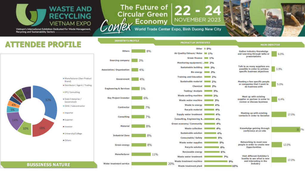 越南废物与回收博览会首次在越南举行,旨在为国内企业带来现代废物处理和回收技术及解决方案,从而在循环经济的方向上,为改善越南乃至全球的环境问题做出贡献。 此次活动为越南企业提供了一个完美的会面和交流场所,让他们能够与废物收集、回收、资源回收和可持续发展领域的全球领先解决方案提供商一起探索突破和新前景。