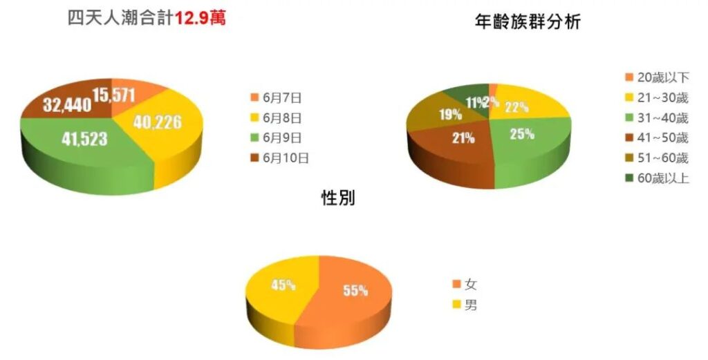本次展会共吸引参展人数达12.9万人,其中8号和9号迎来人流高峰,分别达40226人和41523人。参展人群性别分布中,女性占比55%,男性占比45%。年龄主要集中于31至40岁,其次是21至30岁和41至50岁人群。