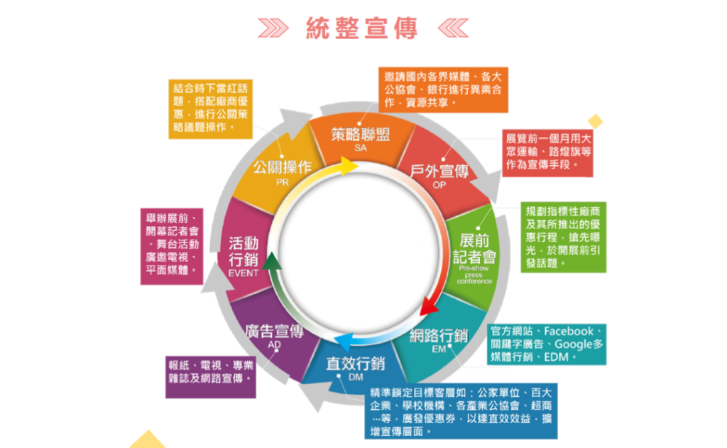 本次展会宣发策略全面且多样,包括多渠道平台宣传、展前记者会、优惠活动、户外地推、媒体及杂志报道以及网络宣传等。其中,Facebook总曝光量高达8,385,668次,Google关键字广告总曝光量达117,717次,充分展示了展会的广泛影响力。