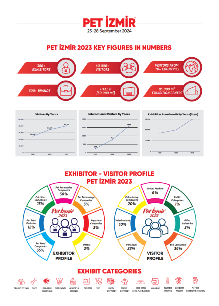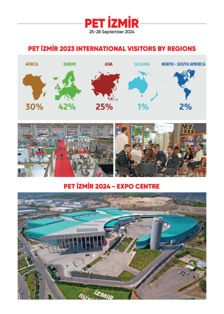 PET İZMİR 2024宠物用品展将继续在土耳其最大的展览中心Fuarizmir / Gaziemir举行,为其参与者提供了4天的时间,国际参观者对此表现出极大的兴趣,行业专业人士也非常期待,以便该行业尽快达到其出口目标。未来几年展览会将继续为自己赢得声誉。