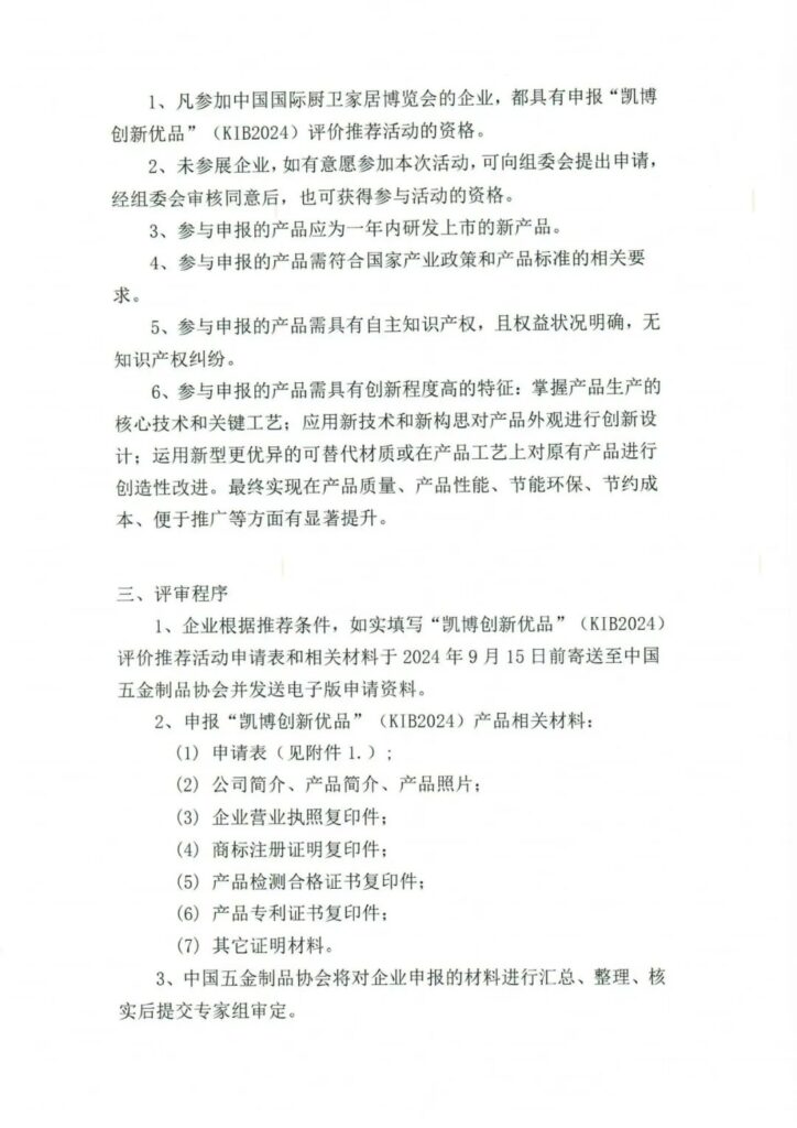 1、凡参加中国国际厨卫家居博览会的企业,都具有申报“凯博创新优品”(KIB2024)评价推荐活动的资格。