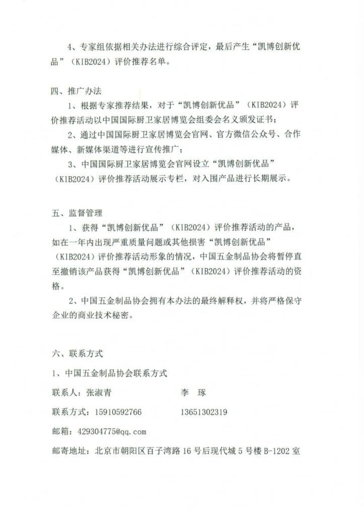 1、获得“凯博创新优品”(KIB2024)评价推荐活动的产品,如在一年内出现严重质量问题或其他损害“凯博创新优品”(KIB2024)评价推荐活动形象的情况,中国五金制品协会将暂停直至撤销该产品获得“凯博创新优品”(KIB2024)评价推荐活动的资格。