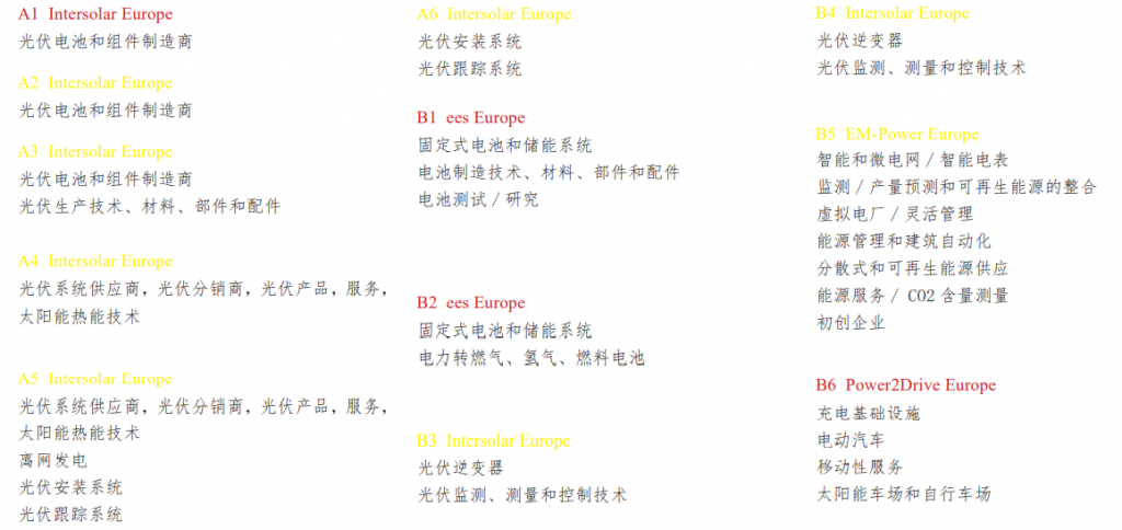 蓄电池+储能器:蓄电池与储能技术;电极材料、电解质、分隔器、电池膜;制造设备及配件;自动化生产;电力电子技术设备;外壳、冷却、通风等组件;测试、测量和检测技术;可充电的蓄电池;用于移动及固定应用的蓄电池产品;超级电容器;回收技术和二次利用方案;回收技术;安全技术;储能解决方案/应用;产品及生产安全技术;研究和开发 燃料电池+氢能:培训和进修;移动蓄电池技术;咨询;燃料电池 ;燃料电池组件;燃料电池移动式应用;燃料电池固定式应用;燃料电池特殊应用;燃料电池部件;车辆技术;研究与开发;信息通讯技术;材料;生产技术;试验台;氢能源生产;氢能源存储;研究和开发;材料;生产技术;特殊工艺;测试台;氢能源开发;氢能源基础设施;氢能源储存;工业BHKW(热电联产机组)和储能器解决方案;培训、进修和咨询;Smart grids(智能电网) 电动车解决方案:新机动解决方案;充电基础设施;汽车技术;信息及通信技术;生产工艺;研究和开发;咨询、服务、培训;Smart grids(智能电网) 未来动力解决方案:动力解决方案(动力传动系、电力电子技术、储能技术、电学);汽车技术(双轮车和轻型车、小客车、商务车、专用车辆);信息与通信技术(ICT);生产技术;研究与开发;服务、咨询、教育